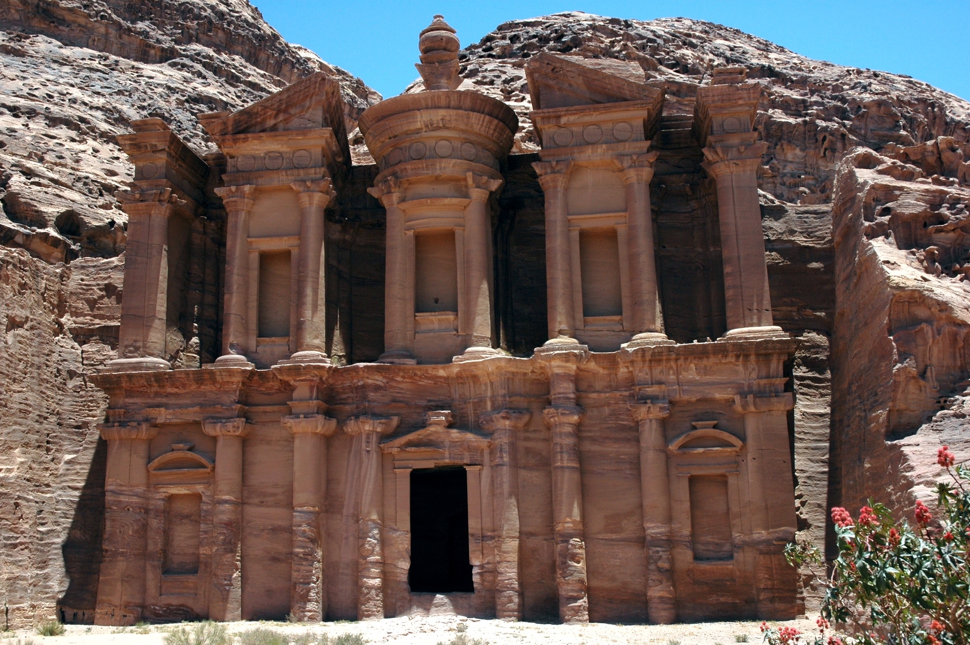 Située entre la Mer Morte et le golfe d’Aqaba, à environ 230 km au Sud d’Amman la capitale jordanienne, Pétra est érigée au cœur d’une vallée fertile dans la région montagneuse d’Édom.